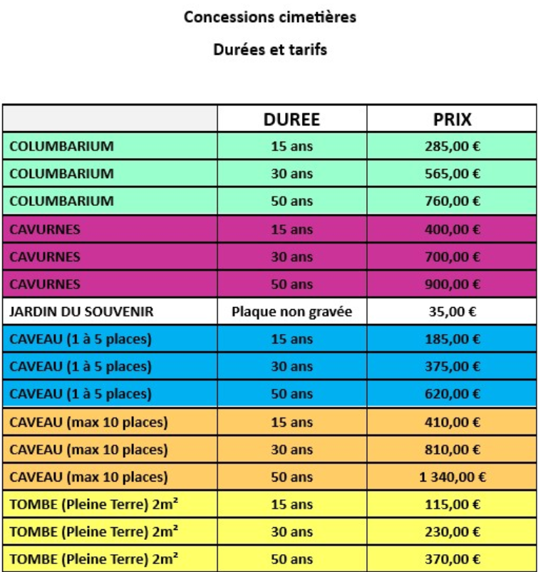 • Les concessions pour fondation de sépultures privées pour l’inhumation d’un cercueil ou d’une urne, dont les durées et tarifs sont votés par le conseil municipal.
