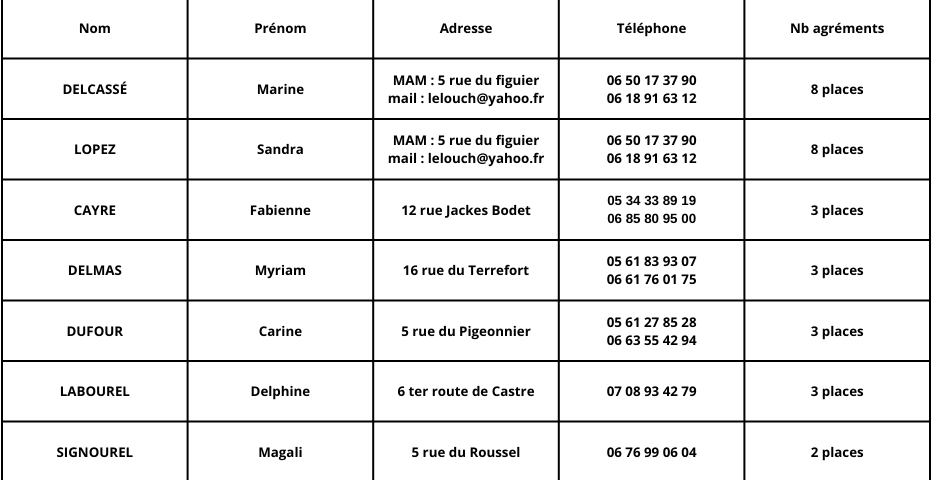 Petite Enfance Assistantes maternelles agréesLocaliser un(e) assistant(e) maternel(le) près de chez vous Structure d’accueil associativePrésidente – Mme SARRAMIA 05 61 83 82 46 5, avenue Maréchal Foch contact@crechedremil.fr >> site internet Structure d’accueil associativeAssistantes maternellesPrésidente – Carine DUFOUR 06 63 55 42 94 larecredesassmat@gmail.com >> site internet >> facebook Structure d’accueil associativeTeddy et TartineMaison d’assistantes maternelles 5 rue des FiguiersPrésidente – Marine Delcassé 06 50 17 37 90 teddyettartine@outlook.fr >> site internet Assistantes Maternelle