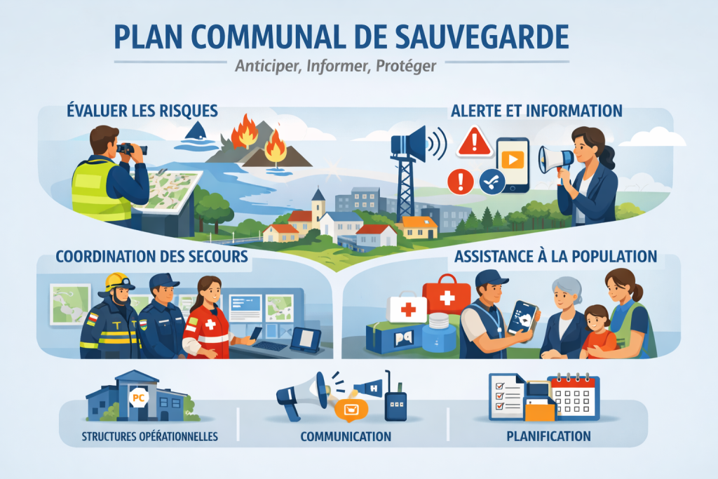 Le Plan Communal de Sauvegarde (PCS) définit l’organisation prévue par la commune pour assurer l’alerte, l’information préventive, la protection et le soutien de la population. Il détermine, en fonction des risques connus, les mesures immédiates de sauvegarde et de protection des personnes, fixe l’organisation nécessaire à la diffusion de l’alerte et des
